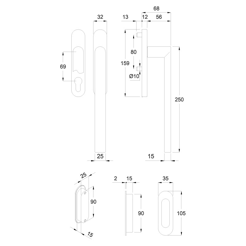 Sliding-door handle set with metal mechanism 90°, fixed/turnable assembled, M6 screws, square spindle 10mm